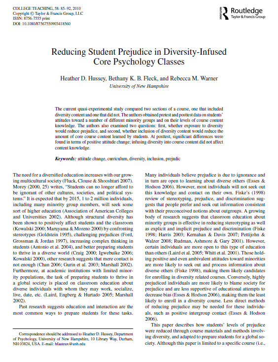 Hussey, H. D., Fleck, B. K., & Warner, R. M. (2010). Reducing student prejudice in diversity-infused core psychology classes. College Teaching, 58(3), 85-92.
